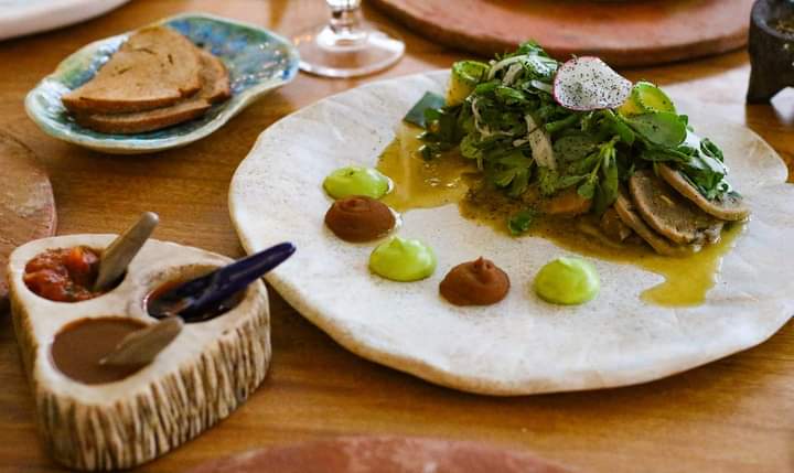 En el restaurante Almoraduz, ubicado en Puerto Escondido, ofertan platillos como el lechón confitado con mole de la casa que se sirve con puré de camote o la barbacoa de lengua de res que se acompaña de cremoso de aguacate, puré de frijol, salsa de tomatillo y ceniza de chiles.