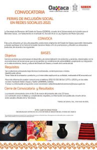 Oaxaca de Juárez, Oax. 03 de marzo de 2021.- Con el objetivo de reforzar las acciones del Gobierno del Estado que permitan alcanzar una mayor inclusión económica de los sectores sociales de la población oaxaqueña y para apoyar a productores y artesanos que han dejado de comercializar sus artículos durante esta contingencia sanitaria por la COVID-19, la Secretaría de Bienestar del Estado de Oaxaca (Sebien) lanzó la convocatoria de la Feria de Inclusión Social en Redes 2021 que concluye el 21 de marzo a las 22:00 horas.