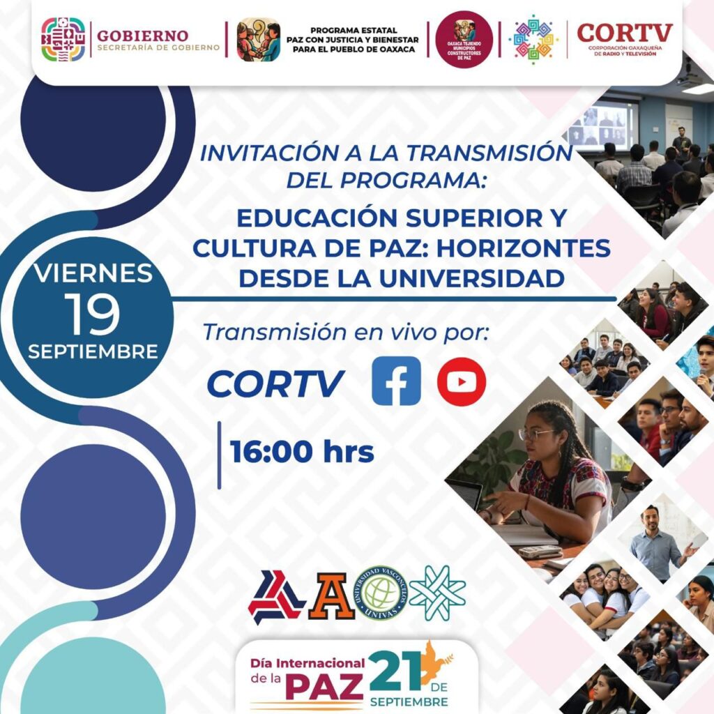 En el marco del Día Internacional de la Paz, a celebrarse este 21 de septiembre, la Sego invitó a representantes de cuatro importantes universidades de Oaxaca para participar en el primer episodio del programa producido por la Corporación Oaxaqueña de Radio y Televisión (Cortv).