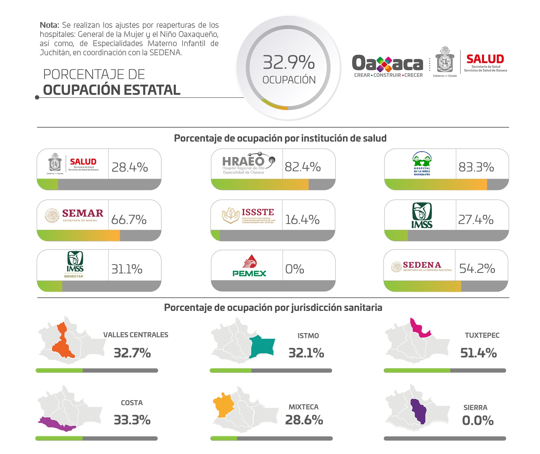 La dependencia precisó que este 4 de noviembre, seis centros médicos registraron el 100% de saturación, al reportarse el ingreso hospitalario de tres nuevos pacientes, por lo que hay un 32.9% de ocupación en general, es decir, hay 136 camas ocupadas, de las 414 destinadas para atender la pandemia.