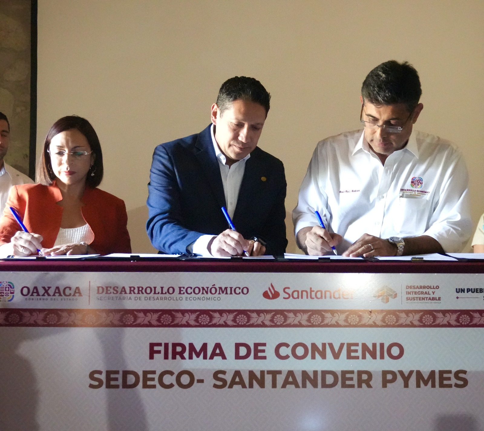 Oaxaca de Juárez, Oax. 16 de mayo 2023.- La Secretaría de Desarrollo Económico (Sedeco) y Santander PyME firmaron un convenio para implementar el programa Oferta PyME Oaxaca con la finalidad de que personas propietarias de pequeñas y medianas empresas accedan a precios preferenciales de diferentes productos financieros como son cuentas de cheques, créditos acordes a sus requerimientos, banca electrónica, nómina y terminal que les permita fortalecer sus negocios.