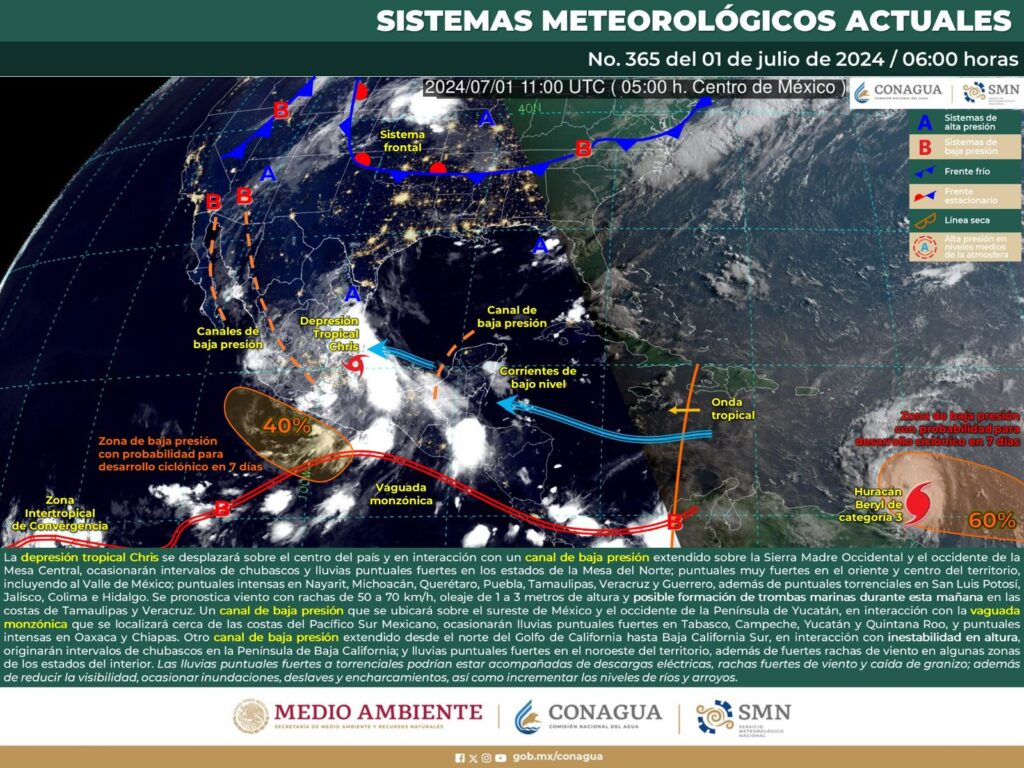 Por otro lado, el ciclón tropical del Atlántico Beryl huracán categoría 4, continúa ganando fuerza como un fenómeno de gran intensidad, por su lejanía no representa peligro para el territorio mexicano; sin embargo, se mantiene en vigilancia.
