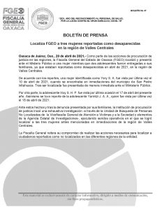 Oaxaca de Juárez, Oax., 20 de abril de 2021.- Como parte de las acciones de procuración de justicia en las regiones, la Fiscalía General del Estado de Oaxaca (FGEO) localizó y presentó ante el Misterio Público a una mujer mientras que dos adolescentes fueron entregadas a sus familiares, ya que estaban reportadas como desaparecidas en abril de 2021, en la región de Valles Centrales.