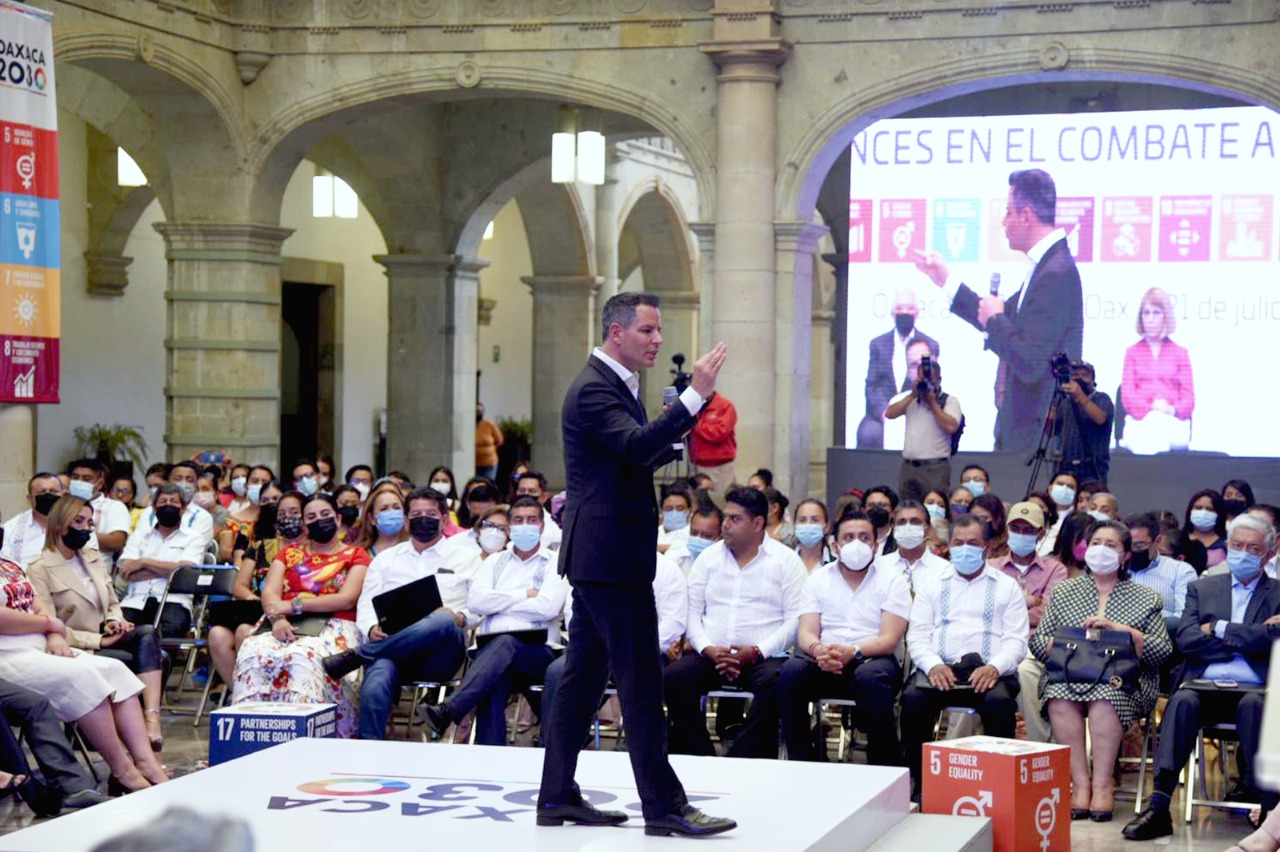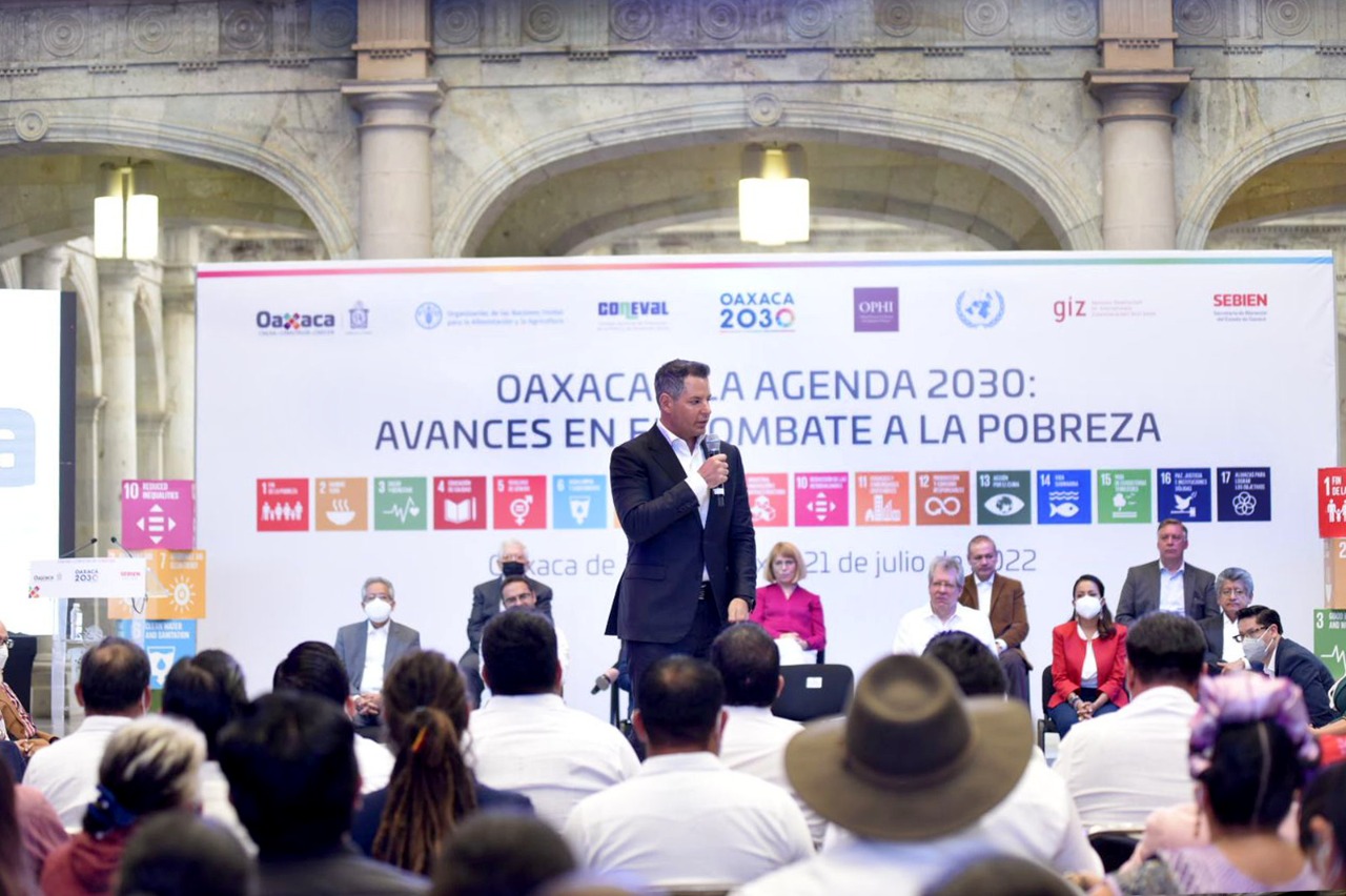 En este evento, en el que participaron también el coordinador Residente del Sistema de las Naciones Unidas en México, Peter Grohmann, así como la coordinadora general de Análisis de la Pobreza del Coneval, Alida Gutiérrez Landeros, el Mandatario Estatal reiteró el compromiso de su gobierno con el bienestar de las familias oaxaqueñas y enumeró las acciones y programas que durante su administración han logrado que en 2020, Oaxaca haya registrado el porcentaje de pobreza más bajo en su historia.