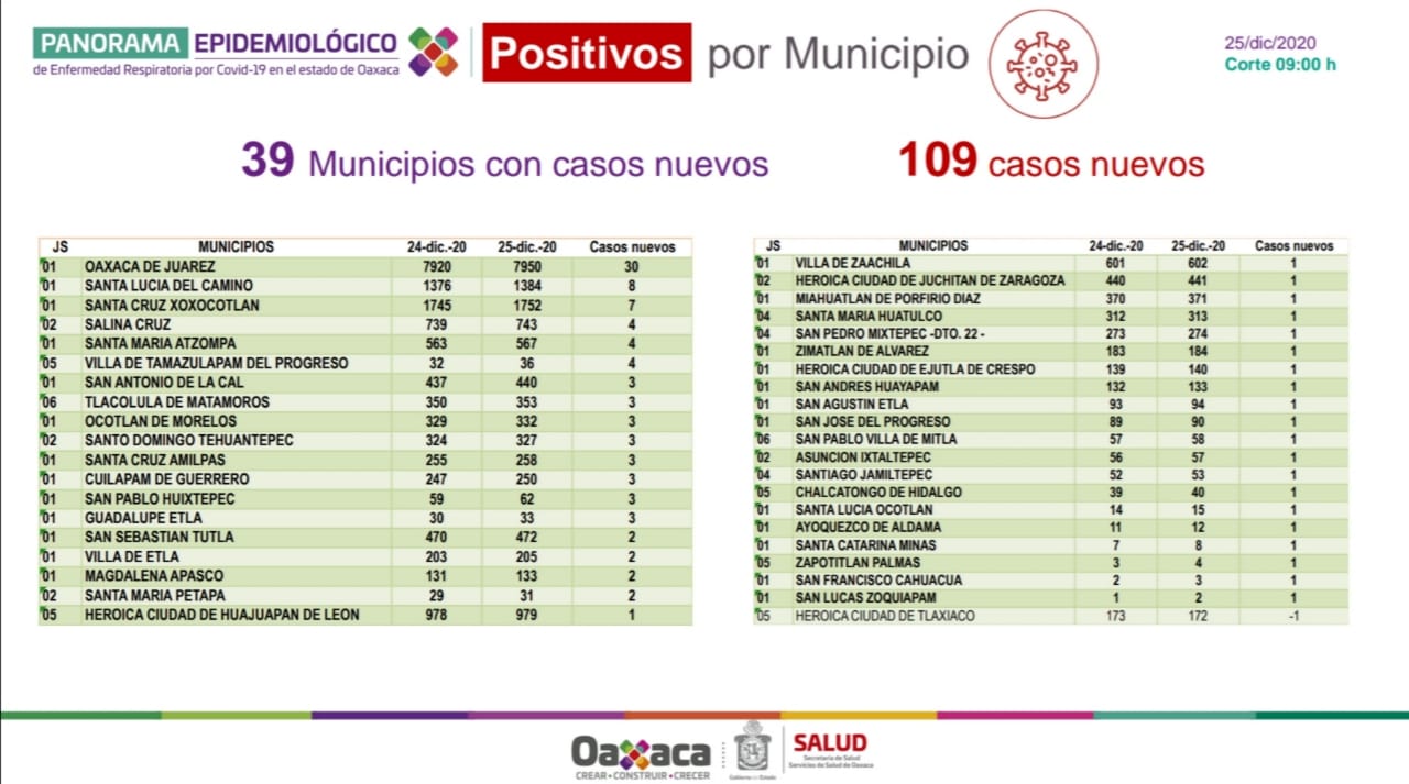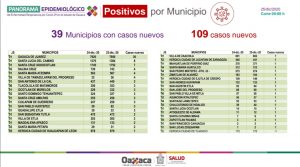 Agregó que se identificaron 39 municipios con la presencia de nuevos contagios, siendo los de mayor número: Oaxaca de Juárez con 30, Santa Lucía del Camino con ocho, Santa Cruz Xoxocotlán con siete, Salina Cruz, Santa María Atzompa, Villa de Tamazulapam del Progreso, con cuatro cada uno, el resto tres, dos y uno.