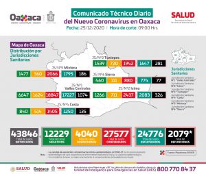 Oaxaca de Juárez, Oax. 25 de diciembre de 2020.- 109 personas más dieron positivo a COVID-19 en las últimas 24 horas, con lo que la cifra de casos confirmados por los Servicios de Salud de Oaxaca (SSO) llegó a 27 mil 577; además, se notificaron dos decesos más, de ahí que el número de fallecimientos ascendió a dos mil 079.