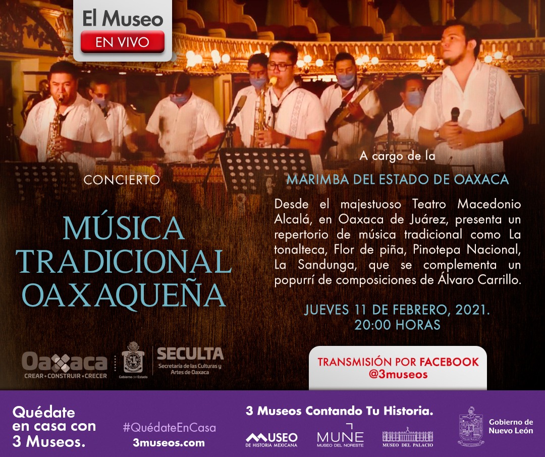 Es por ello que, debido al éxito del talento oaxaqueño, este jueves 11 de febrero, a las 20:00 horas, tendrá lugar el concierto virtual de la Marimba del Estado de Oaxaca, a través de la página de Facebook: https://www.facebook.com/3museos.