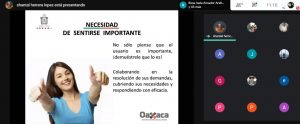 Oaxaca de Juárez, Oax., 22 de marzo de 2021.- La Secretaría de Administración mediante la Unidad de Desarrollo Profesional, llevó a cabo la capacitación “Calidad en la atención y servicio a la ciudadanía”, actividad que integra el trabajo permanente que realiza el capital humano del Gobierno del Estado, para reforzar conocimientos, habilidades y actitudes que ayudan a mejorar la atención al público.