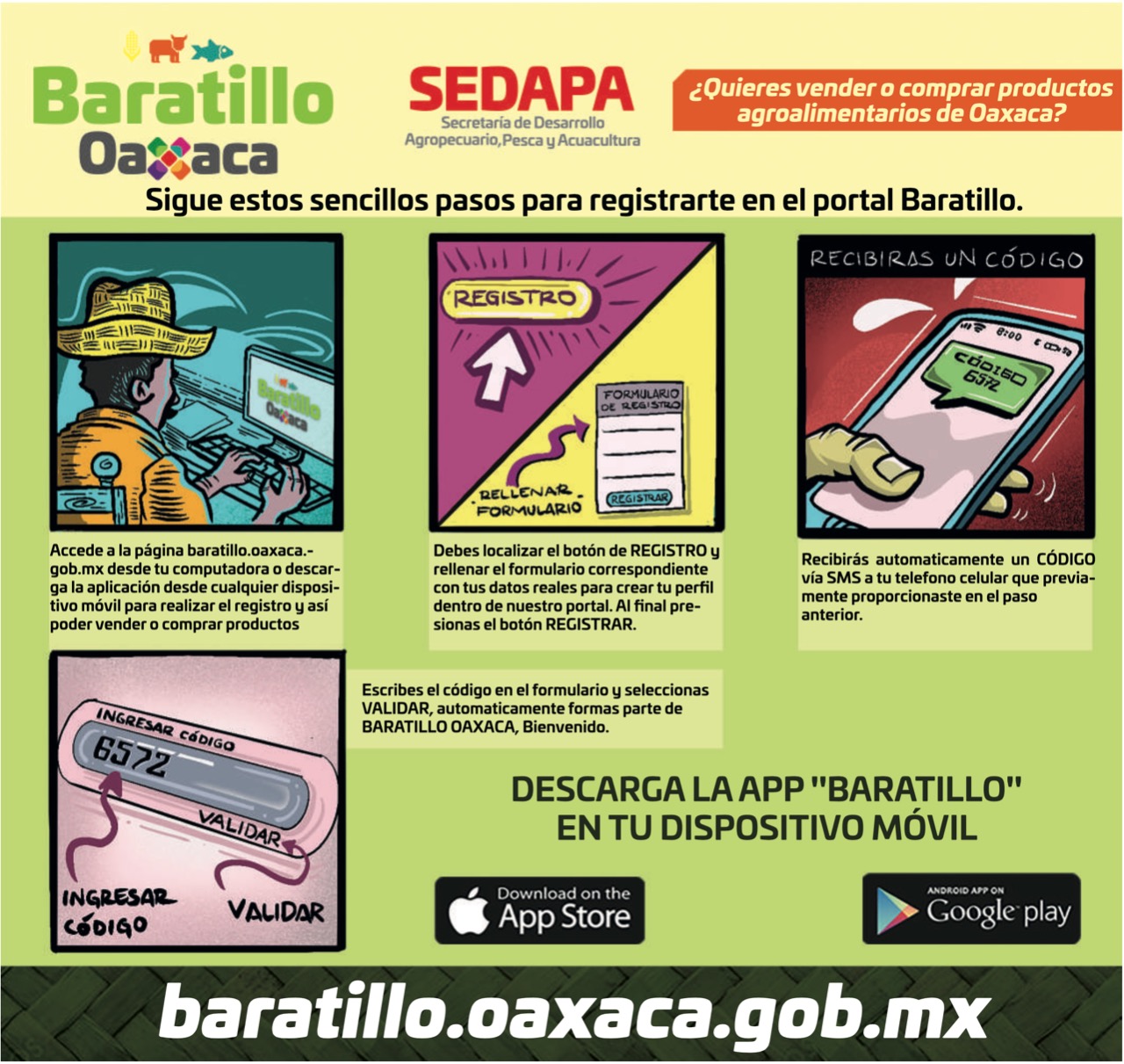 Es por ello que el Gobierno del Estado, a través de la Secretaría de Desarrollo Agropecuario, Pesca y Acuacultura (Sedapa), desarrolló la plataforma digital “Baratillo Oaxaca”, mediante la cual las y los productores del campo pueden ofertar y comercializar sus productos de una manera sencilla y segura, sin intermediarios.