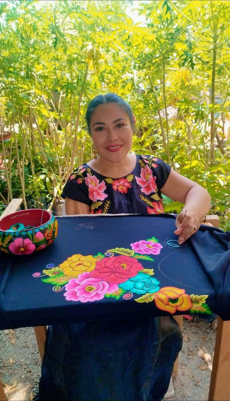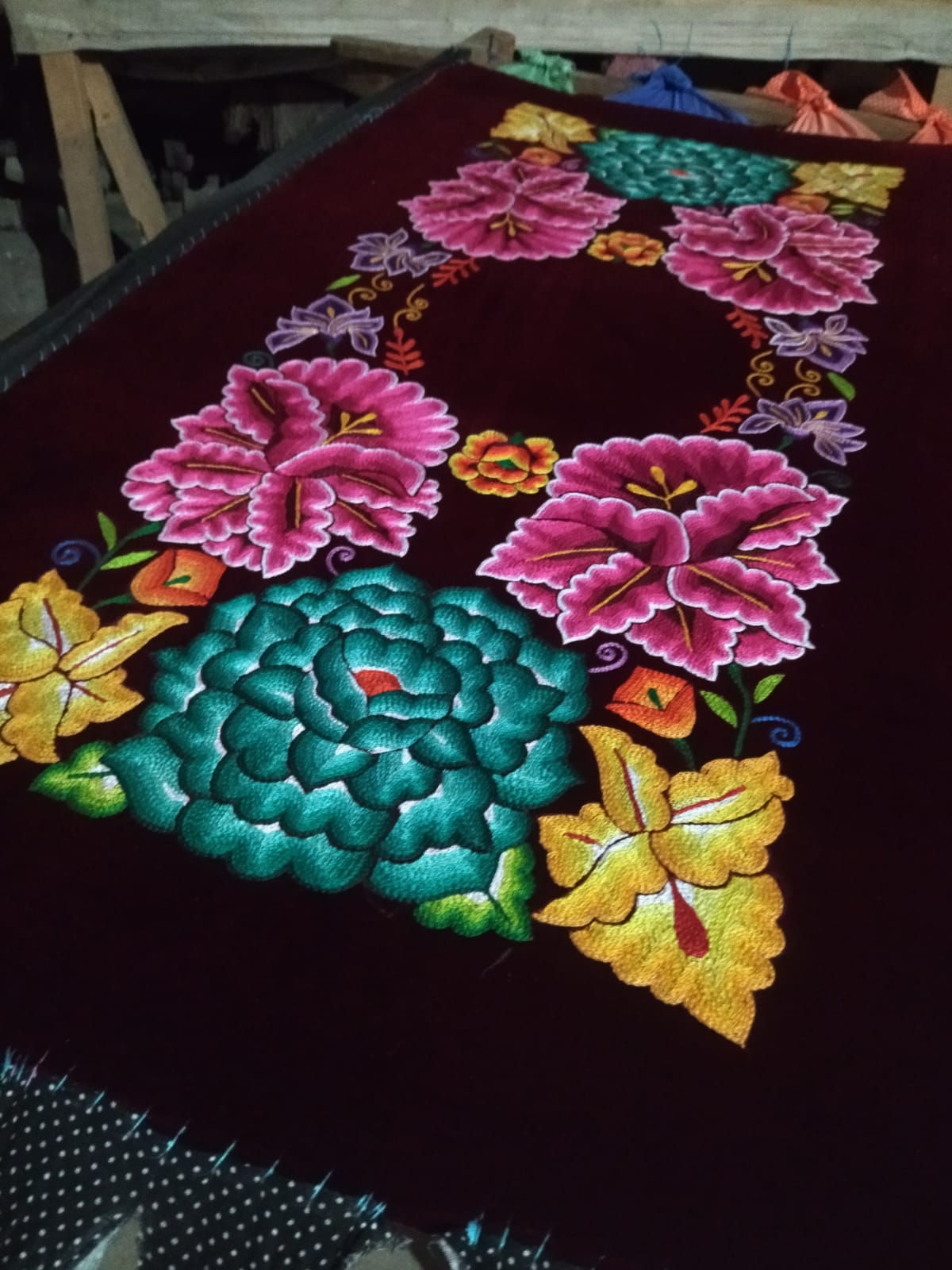 A su vez, Diana Laura Ramírez Toledo del municipio de la Heroica Ciudad de Juchitán de Zaragoza, en la región del Istmo de Tehuantepec, presentó sus textiles bordados tradicionales sobre terciopelo con aguja de gancho, en el que bordan las flores tradicionales de la región e incursionan en nuevos diseños, además de comercializar piezas de la joyería tradicional utilizada en las festividades de las velas istmeñas.
