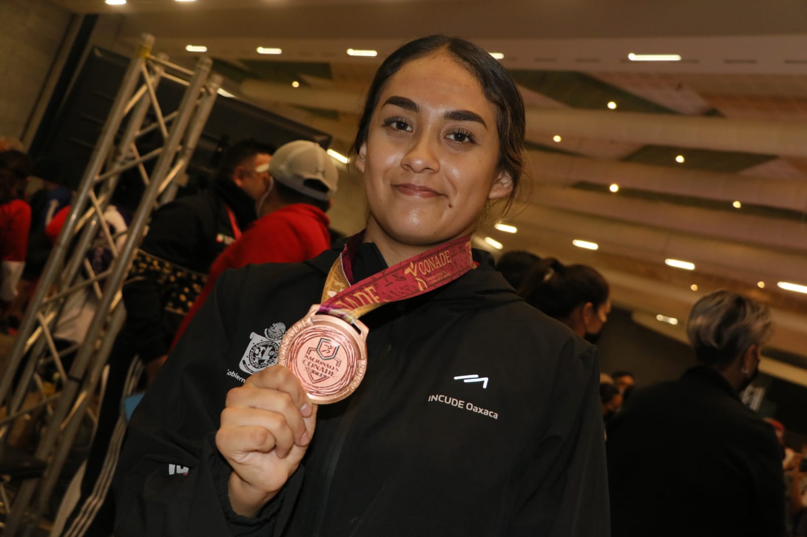 La originaria de Chahuites, en la región del Istmo, logró su mejor marca del año, aunque no superó los 50.25 metros que consiguió en Nuevo León, donde radica actualmente; sin embargo, esto le alcanzó para quedarse con el oro, superando por medio metro a Xóchitl Montoya, de Nuevo León, y por más de tres metros a Deyanira Ceja, de la Ciudad de México.