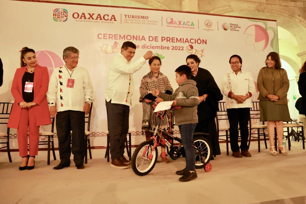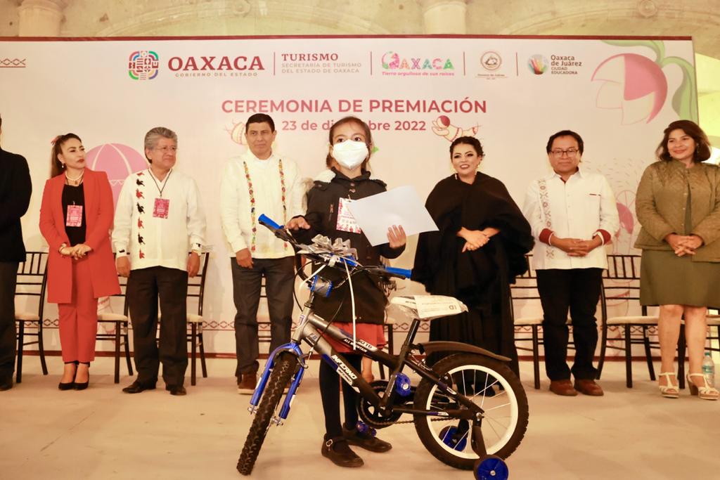 Niñas y niños oaxaqueños también participaron en esta tradición, por lo que en la modalidad de Rábanos categoría Infantil “A”, Maravillosa Victoria Espinoza Martínez fue la ganadora del primer lugar con su creación “El Alebrije oaxaqueño”; mientras que Lucciana Pérez Domínguez obtuvo el segundo con “Dragones en Familia”; y Axel Yahír Raymundo Hernández presentó “Las tres carabelas, acreditándose el tercer lugar.