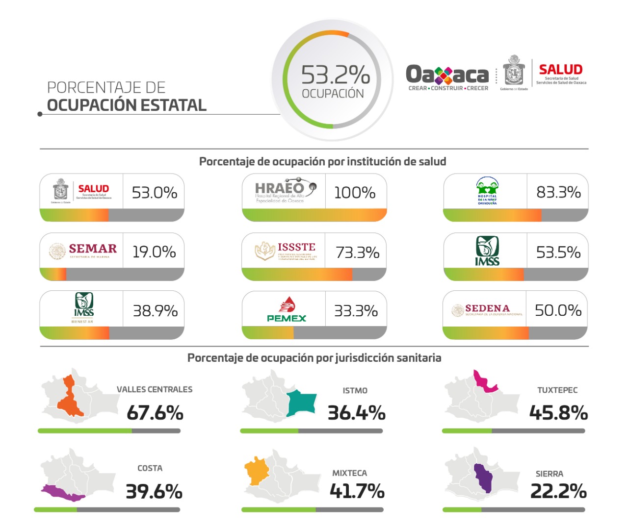 Detalló que la ocupación hospitalaria en Oaxaca se reporta en 53.2% de manera general, se hospitalizaron a 35 nuevos pacientes, y a la fecha hay 328 camas ocupadas de un total de 616, por lo que se reportaron 12 nosocomios al 100% de su capacidad.
