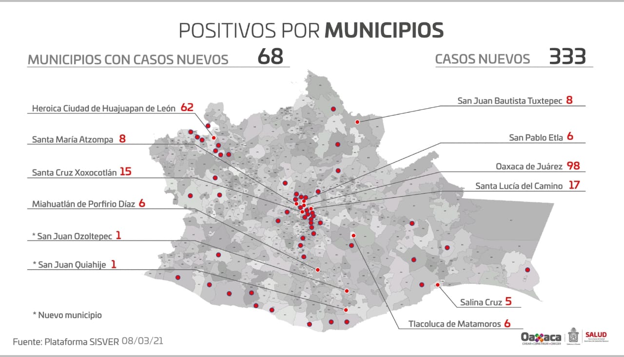 Durante el informe del avance de la pandemia, la jefa de la Unidad de Epidemiología de los SSO, Yuko Nakamura López, indicó que, del 6 al 8 de marzo se confirmaron 333 nuevos casos, que se distribuyen en 68 municipios.