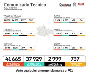 Detalló que, según las estadísticas, Valles Centrales acumuló un global de 28 mil 638 positivos y mil 597 defunciones, Istmo tres mil 432 y 487 muertes, Tuxtepec dos mil 607 y 317 fallecimientos, la Costa dos mil 049 y 200 muertes, Mixteca tres mil 503 y 277 decesos, la Sierra mil 436 y 121 muertes.