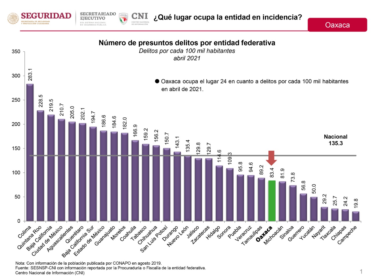 Cabe destacar que, de acuerdo con el informe, en el primer cuatrimestre del año, en Oaxaca se registraron 332.1 delitos del fuero común por cada 100 mil habitantes, es decir, 35% por debajo de la media nacional que es de 508.7 delitos.  Sin embargo, esta distancia se hace aún mayor en el último mes reportado, cuando la incidencia delictiva en la entidad fue un 39% menor al promedio nacional.