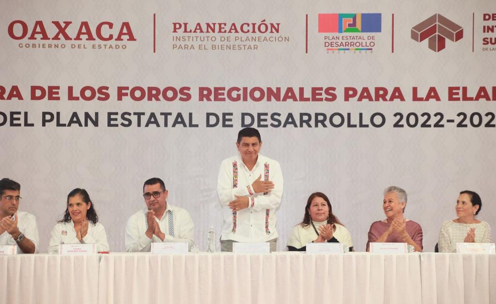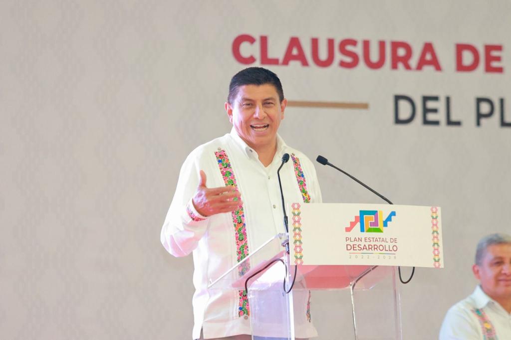 Al encabezar la Clausura de los 8 Foros Regionales para la elaboración del PED 2022-2028, convocó a los pueblos, comunidades, municipios y a todos los sectores sociales a que, con humildad, honradez, honestidad, trabajo, cercanía, sensibilidad y pasión, trabajen por Oaxaca y juntos construir una nueva historia.
