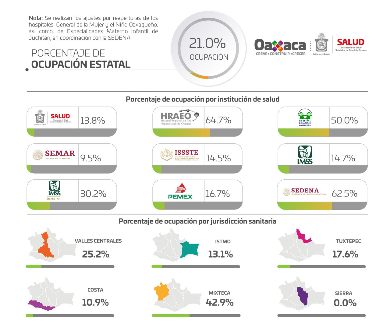 En relación a la ocupación hospitalaria, destaca la Jurisdicción Sanitaria de la Mixteca con 42.9%, seguido de Valles Centrales con 25.2%, Tuxtepec con 17.6%, Istmo con 13.1%, Costa con 10.9% y Sierra continúa sin reportar camas ocupadas.