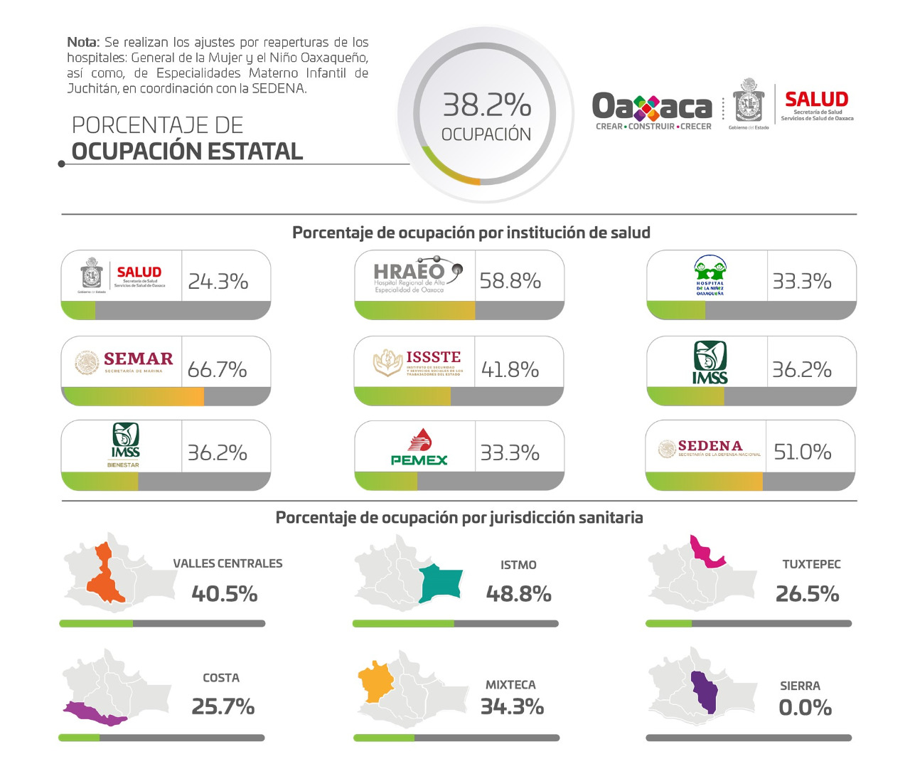 Hasta el último corte, la red de hospitales en el territorio oaxaqueño presentó el 38.2% de saturación, es decir, hay 168 camas ocupadas de un total de 440; cinco nosocomios se encuentran al 100% de su capacidad médica, y en las últimas 24 horas se reportó el ingreso hospitalario de dos pacientes.