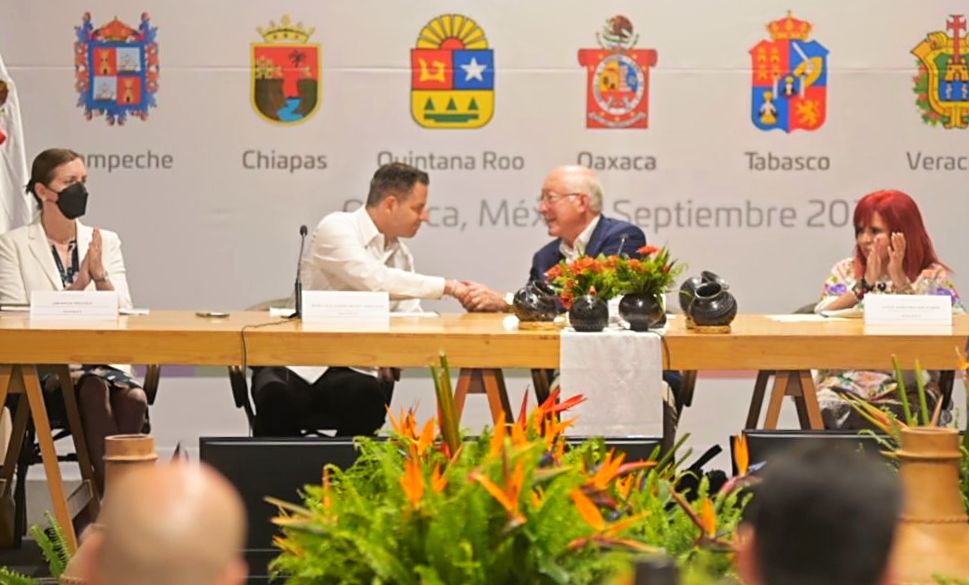 Por su parte, el embajador de Estados Unidos en México, Ken Salazar, enunció que la seguridad es importante para la prosperidad y que el sur-sureste es uno de los lugares más seguros de México, lo que propicia una mayor oportunidad de crecimiento. Reconoció el liderazgo de los gobernadores y gobernadoras de los siete estados que hoy participan en este encuentro para converger y propiciar mayor inversión internacional en beneficio del desarrollo de esta zona, como lo está y seguirá haciendo Estados Unidos a través de diversos proyectos.