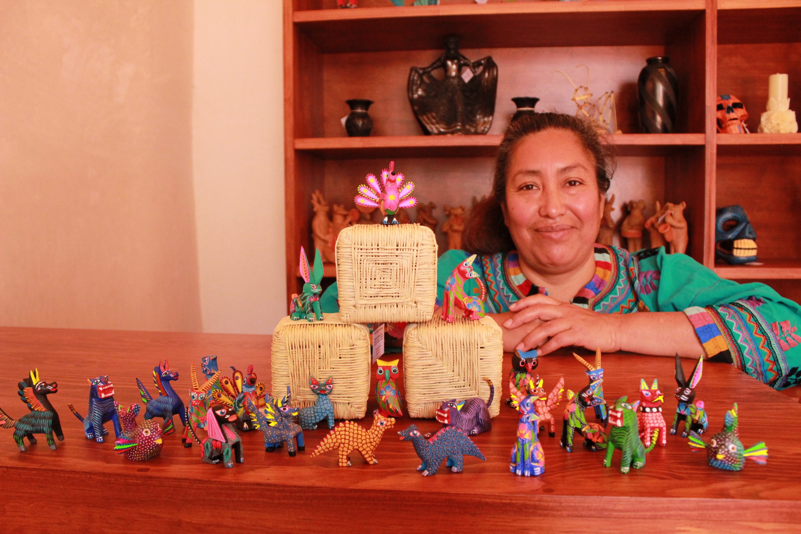 Gracias a la colaboración del Gobierno del Estado, a través del Instituto Oaxaqueño de las Artesanías (IOA), se presentan también “tonas y nahuales de Oaxaca” -alebrijes miniatura- en madera de copal provenientes de San Antonio Arrazola y San Martín Tilcajete, creaciones realizadas por Josefina de la Cruz Morales, Waldo Hernández García, Marco Antonio Ortega y Sergio Santiago.