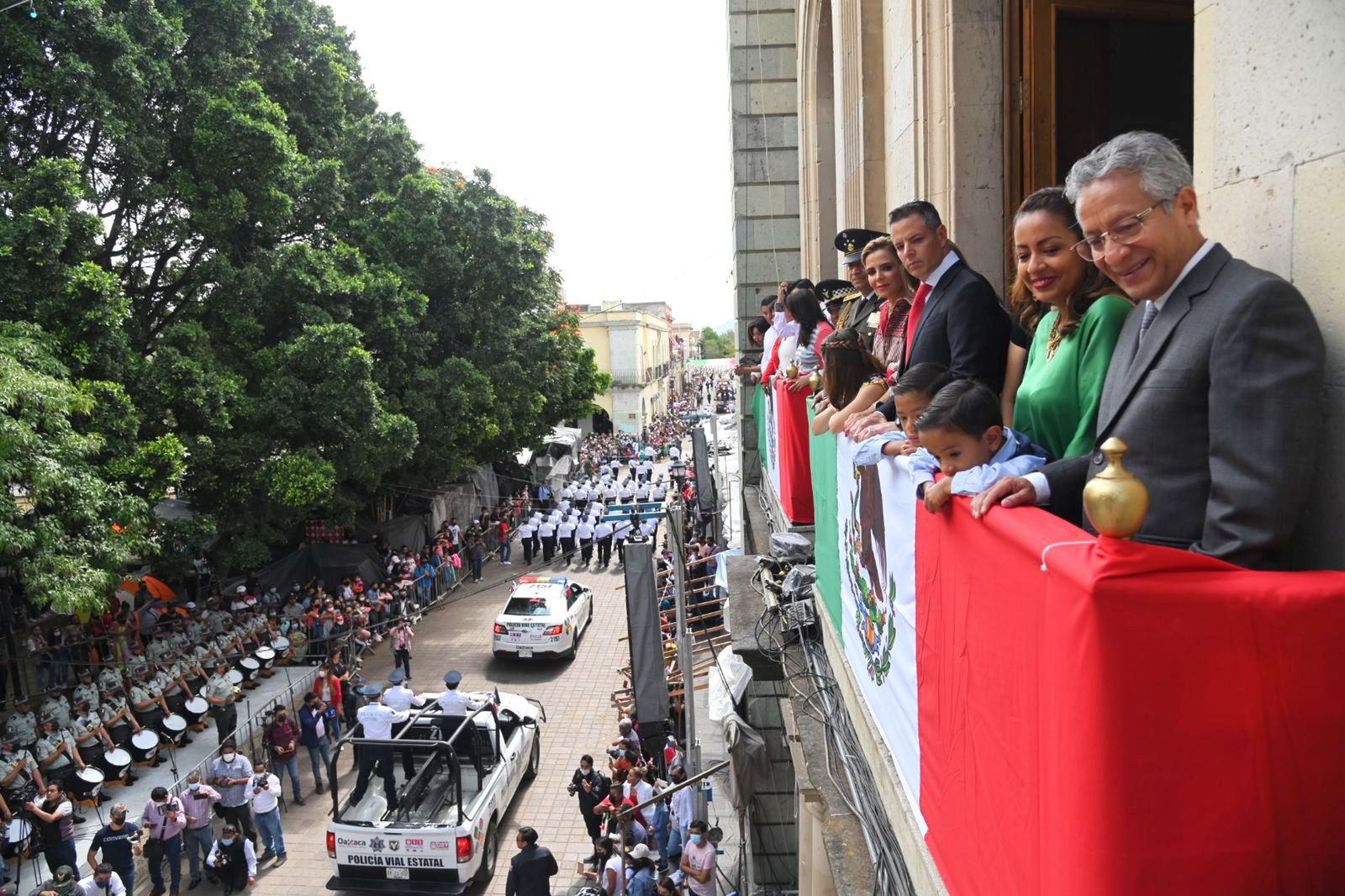 Oaxaca de Juárez, Oax. 16 de septiembre de 2022.- En un ambiente de paz y armonía, familias oaxaqueñas disfrutaron del Desfile Cívico Militar que este viernes se realizó en el marco del 212 Aniversario del inicio de la lucha por la Independencia de México, y que fue encabezado por el gobernador Alejandro Murat Hinojosa, junto con su familia; así como por el general de División Diplomado de Estado Mayor, Francisco Jesús Leana Ojeda, Comandante de la VIII Región Militar, y representantes de los tres órdenes de gobierno, desde el balcón central de Palacio de Gobierno.