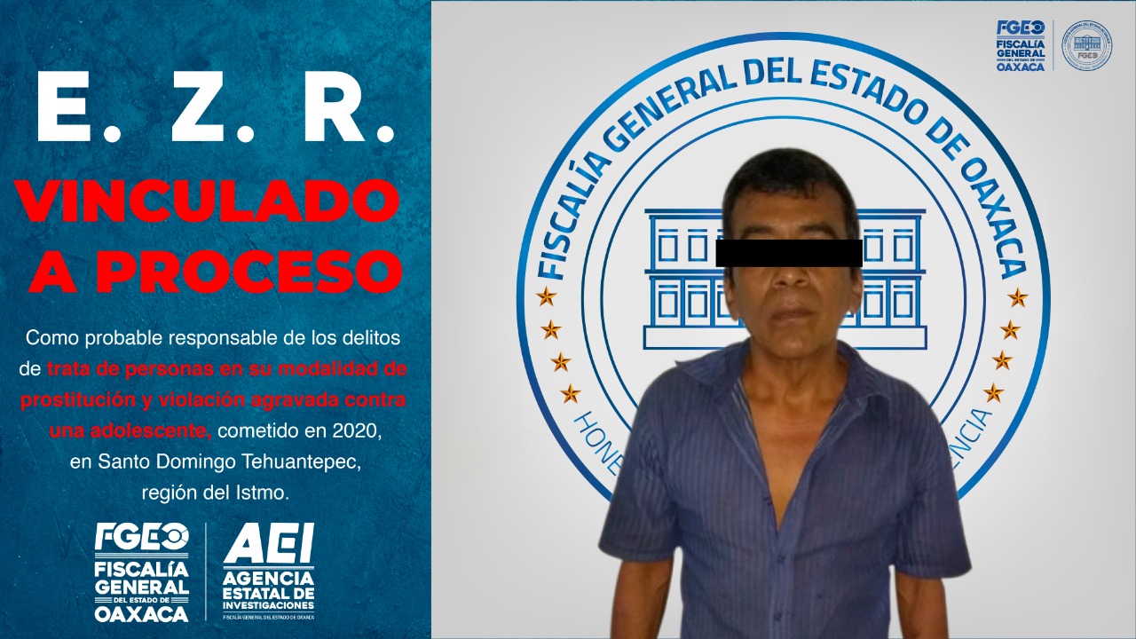 Oaxaca de Juárez, Oax., 2 de febrero de 2021.- La Fiscalía General del Estado de Oaxaca (FGEO), obtuvo auto de vinculación a proceso contra el masculino E. Z. R., probable responsable de los delitos de trata de personas en su modalidad de prostitución ajena agravada y violación agravada en contra de una adolescente de 14 años, cometido entre los meses de mayo y junio de 2020, en jurisdicción de Santo Domingo Tehuantepec, región del Istmo.