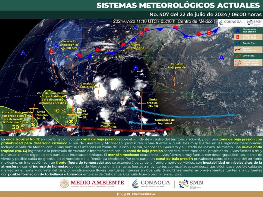 Oaxaca de Juárez, Oax. 22 de julio de 2024.- La Coordinación Estatal de Protección Civil y Gestión de Riesgos (CEPCyGR) informa que el borde delantero de la onda tropical número 13 mantendrá la presencia de lluvias de intensidad variable sin descartar tormentas de corta duración, asociada con actividad eléctrica y rachas de viento durante la tarde-noche.