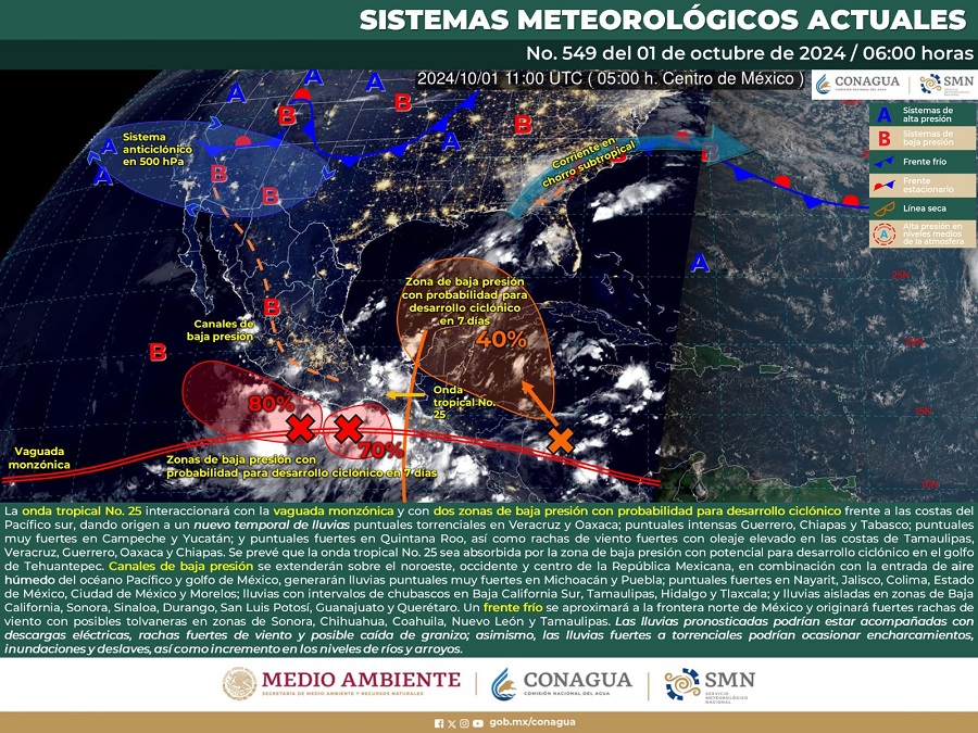 De acuerdo con el pronóstico del tiempo emitido por la Comisión Nacional del Agua (Conagua), esta onda tropical se desplazará sobre el sureste del país, interactuando con la vaguada monzónica (un cinturón de inestabilidad atmosférica) y dos bajas presiones con potencial para desarrollo ciclónico frente a las costas del Pacífico Sur.