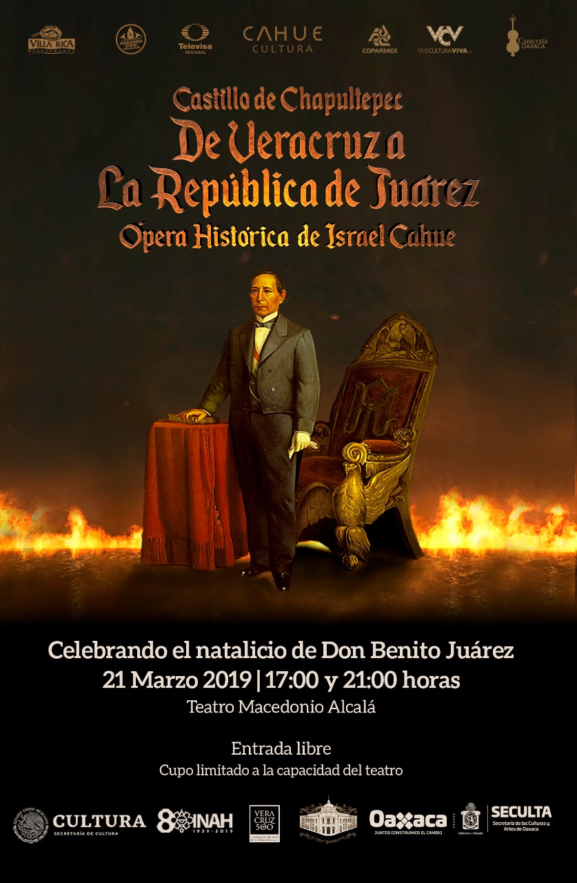 Oaxaca de Juárez, Oax., 21 de marzo de 2019. Para celebrar el 213 aniversario del natalicio del Licenciado Benito Juárez García, este 21 de marzo se presentará la ópera histórica “Castillo de Chapultepec, de Veracruz a la República de Juárez” del compositor Israel Cahue, en el Teatro Macedonio Alcalá, a las 17:00 y 21:00 horas.