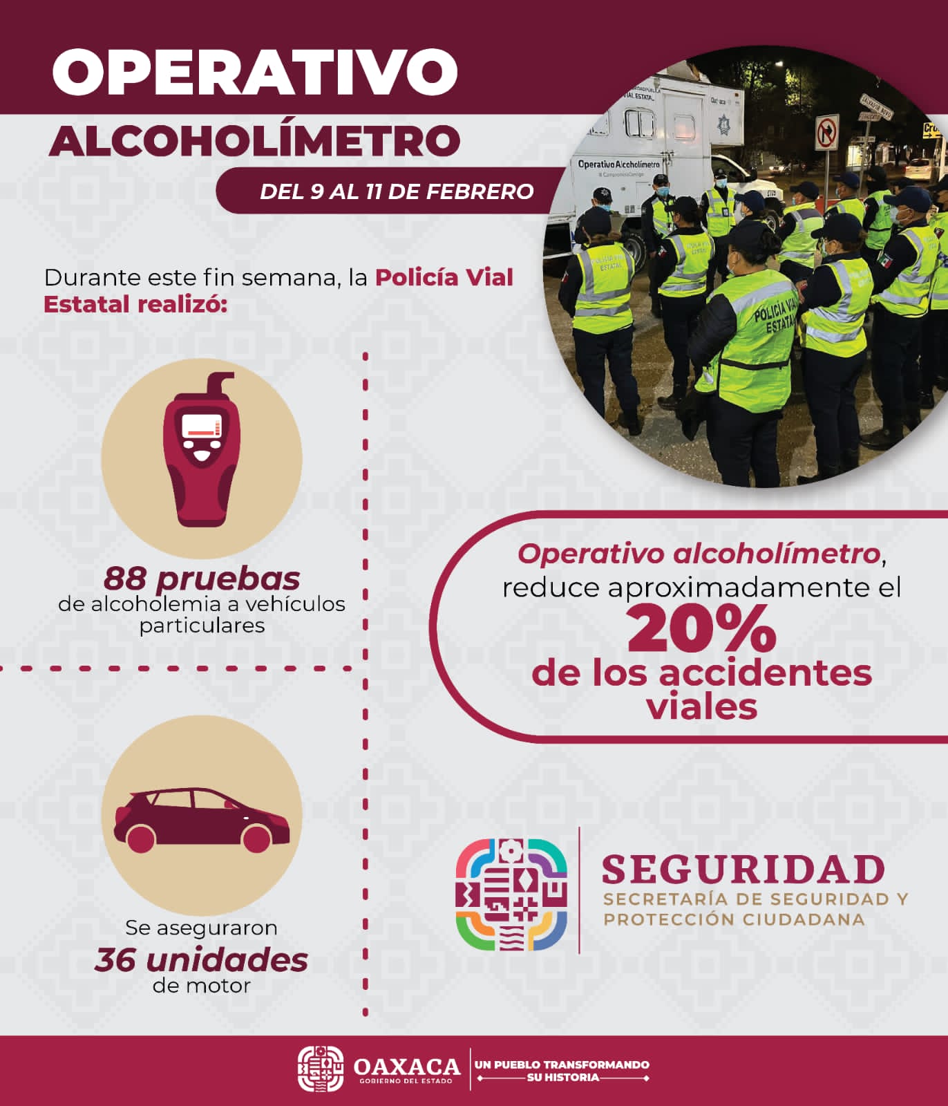 Por otra parte, el director de la corporación hizo un llamado a la población en general a no compartir la ubicación de dicho operativo; agregó también que se continuará realizando tareas de concientización para evitar que las y los automovilistas manejen con cansancio o bajo el influjo de alguna sustancia. La SSPC mantiene este tipo de acciones con el objetivo de salvaguardar la integridad física y patrimonial de la ciudadanía; incluyendo la de quienes conducen un vehículo de motor.