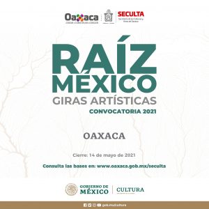 Oaxaca de Juárez, Oax. 30 de marzo de 2021.- Como parte del programa Bosque de Chapultepec: Naturaleza y Cultura, la Secretaría de Cultura Federal a través del Festival Internacional Cervantino y Circuitos Culturales, en coordinación con la Secretaría de las Culturas y Artes de Oaxaca (Seculta), invitan a creadores y artistas a participar en la presente convocatoria “Raíz México: Giras artísticas Oaxaca”.