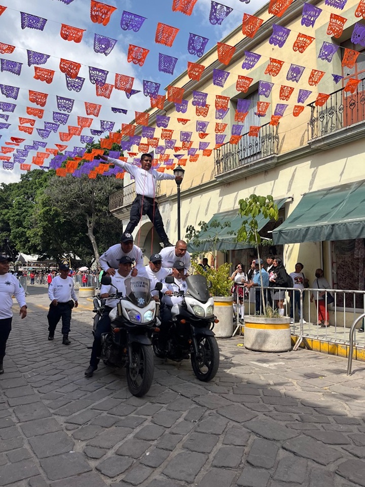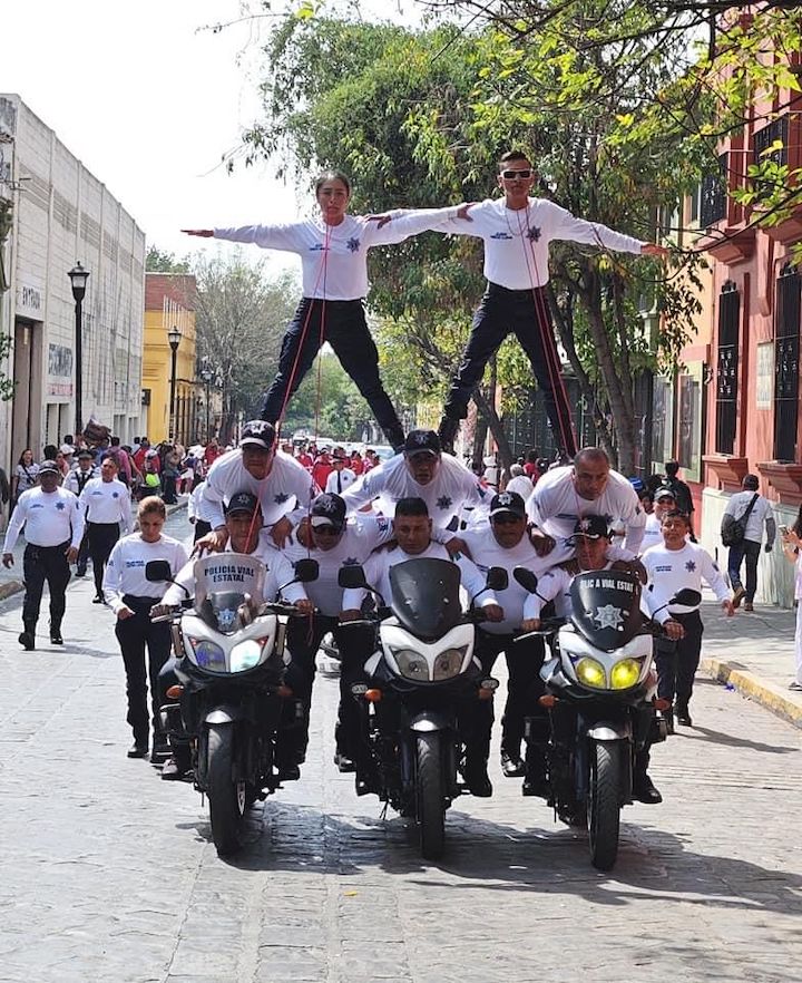 Las y los elementos de esta corporación acompañados por el director general, Toribio López Sánchez, presentaron algunas acrobacias en motocicleta, que fueron aplaudidas por el público que se dio cita en la ruta que comprendió el contingente.