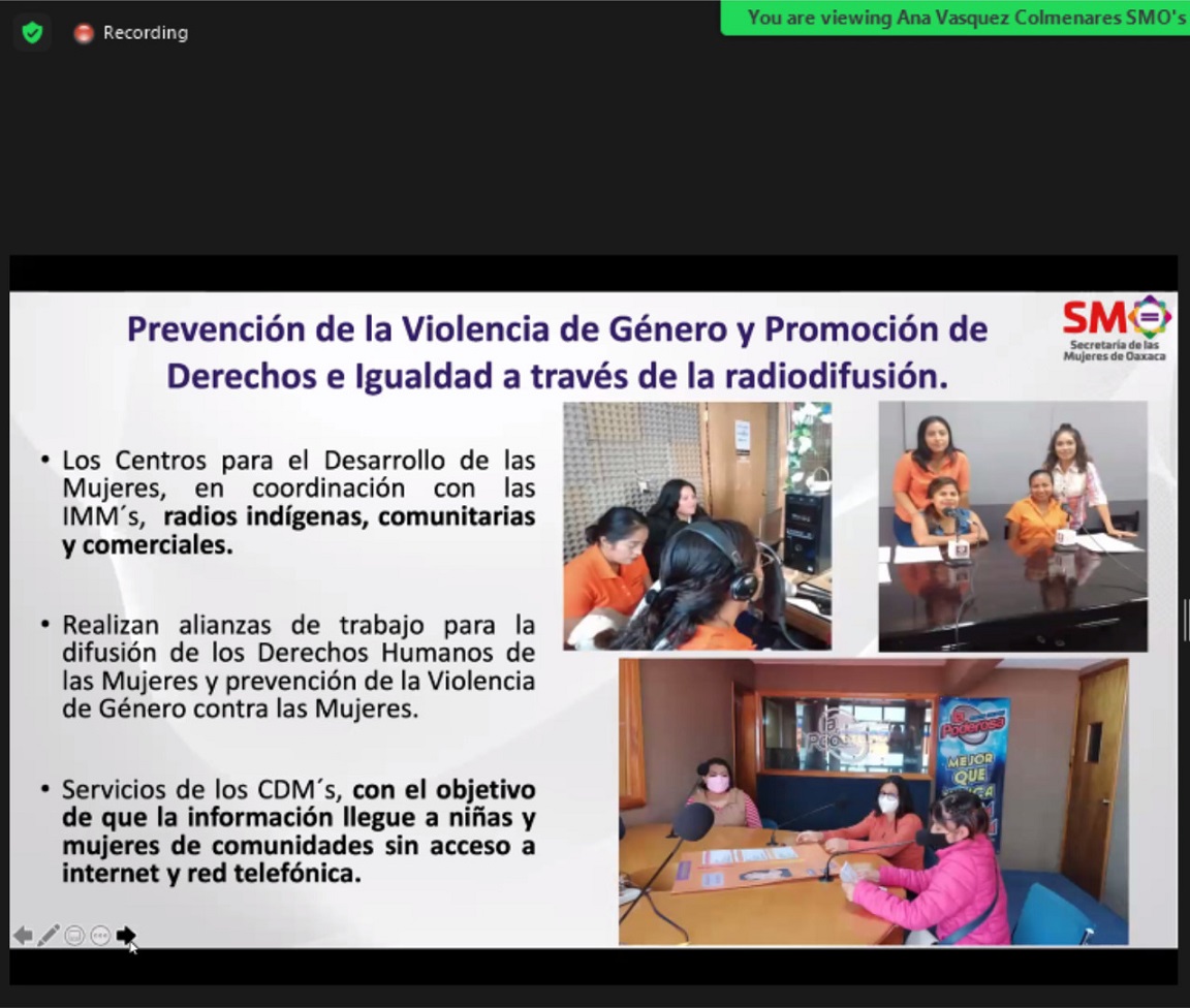 En coordinación con las 510 Instancias Municipales de las Mujeres, radios indígenas, comunitarias y comerciales, los CDM realizan alianzas de trabajo para la difusión de los derechos humanos de las mujeres y prevención de la Violencia de Género contra las Mujeres a fin de que la información llegue a niñas y mujeres de comunidades sin acceso a internet y red telefónica, aseveró la funcionaria estatal.