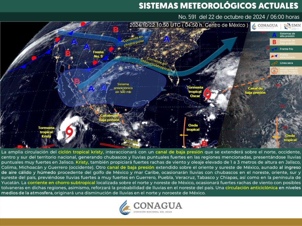 De acuerdo con el pronóstico del tiempo emitido por la Comisión Nacional del Agua (Conagua) un canal de baja presión y pulsaciones de humedad de la vaguada monzónica -un cinturón de inestabilidad atmosférica- extendida sobre el Océano Pacífico, aunado a la amplia circulación del ciclón tropical “Kristy” seguirán manteniendo condiciones de inestabilidad en el estado.