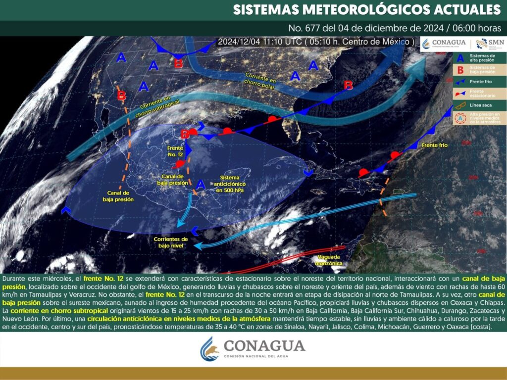 Además, el frente frío número 12 no completará su recorrido hacia el sureste y entrará en proceso de disipación al norte de Tamaulipas, mientras que un frente secundario -13- podría formarse al norte del Golfo de México con poco efecto para Oaxaca.