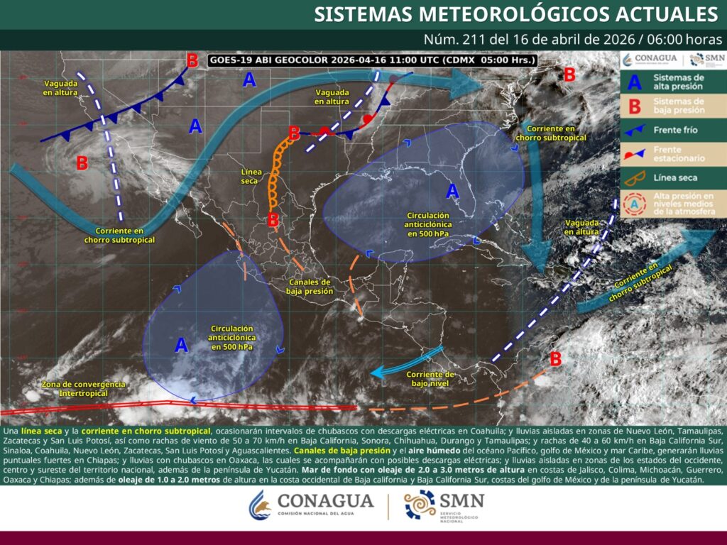 Oaxaca de Juárez, Oax., 16 de abril de 2026.- La Coordinación Estatal de Protección Civil y Gestión de Riesgos (CEPCyGR) informa que se prevén lluvias con chubascos aislados en algunas zonas de la Sierra Sur, mientras que en el resto del estado dominará tiempo seco, con incremento en los periodos soleados, cielos mayormente despejados y alta radiación solar.