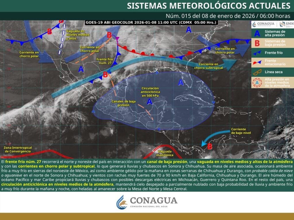 Lo anterior, se debe a una circulación anticiclónica que se desplazará durante este jueves hacia el oriente del Golfo de México, permitiendo el ingreso del frente frío número 27, el cual tendrá efectos directos y traerá mezclas invernales durante el fin de semana.