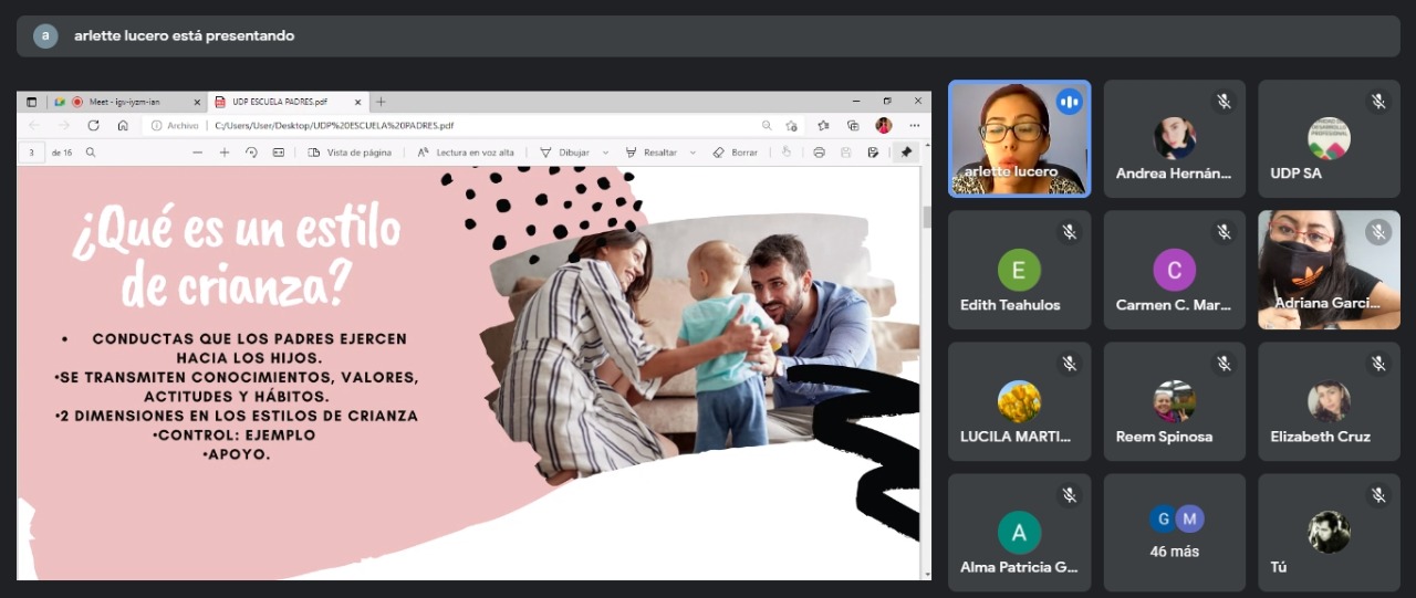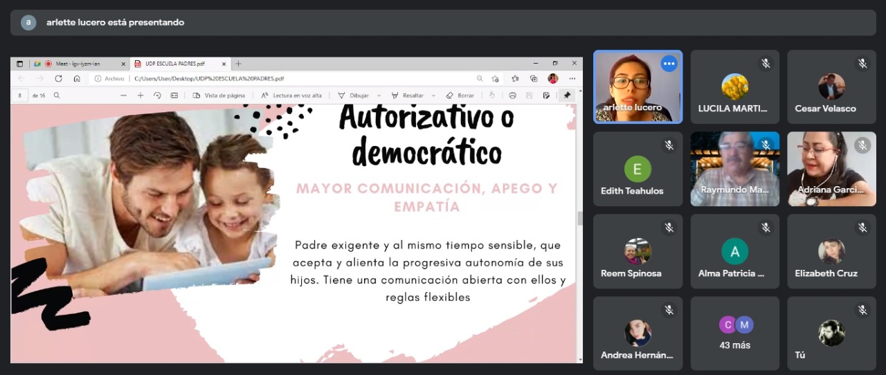 Esta charla, realizada de manera virtual con la implementación de plataformas digitales, fue realizada por Arlette Lucero López, quien orientó a mujeres y hombres sobre el estilo de crianza, que se caracteriza por las conductas que se ejercen a niñas y niños, transmitiendo conocimientos, actitudes y hábitos que serán vitales para el crecimiento.