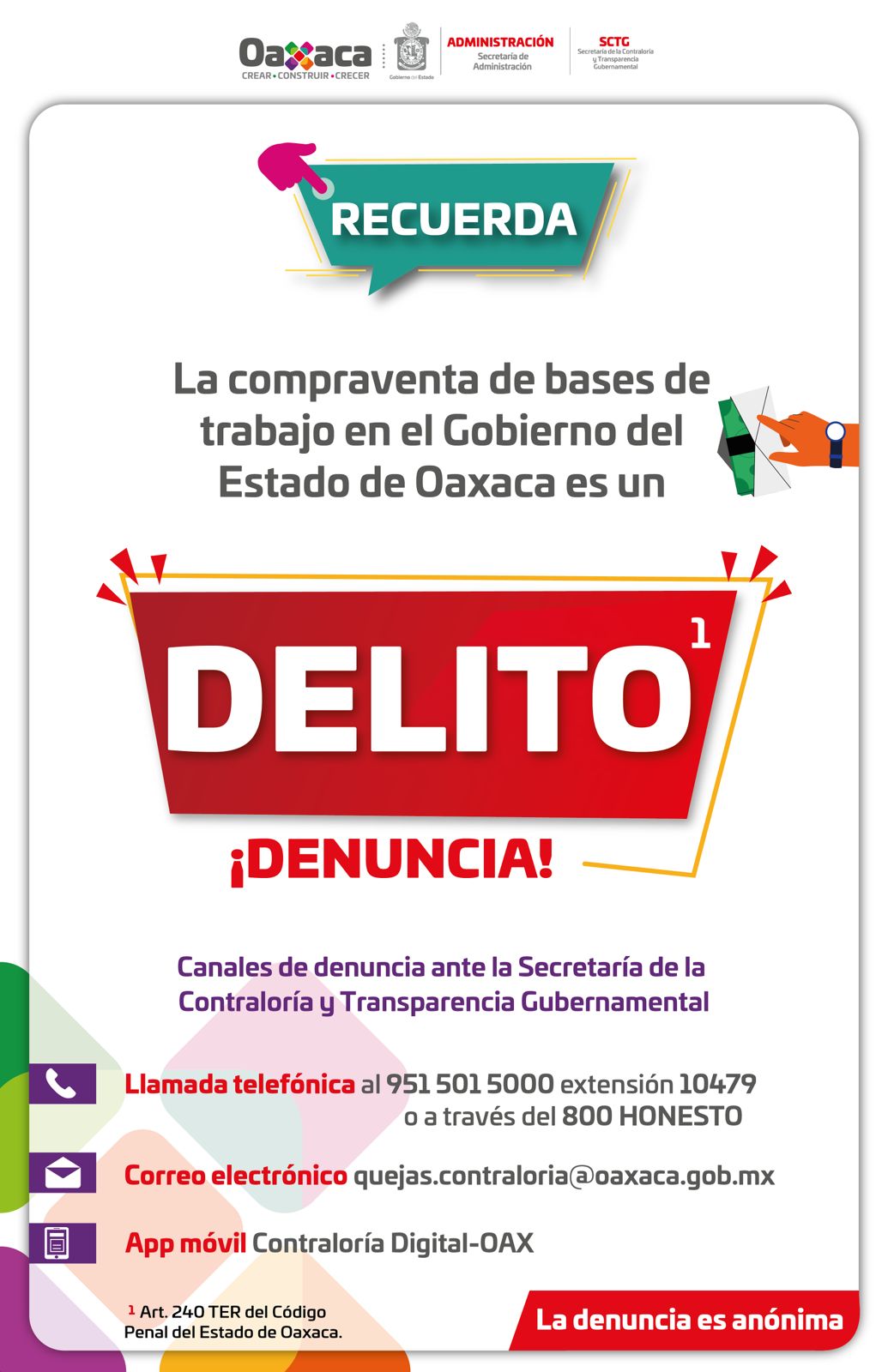 La denuncia por este hecho es anónima y se realiza ante la Secretaría de la Contraloría y Transparencia Gubernamental, a través de los siguientes canales: