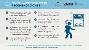 Oaxaca de Juárez, Oax. 31 de agosto de 2022. La Coordinación Estatal de Protección Civil de Oaxaca (CEPCO), comunicó que las condiciones del tiempo para las próximas horas, como parte de la temporada de lluvias y ciclones tropicales, podrían generar inundaciones repentinas, crecidas de ríos y arroyos de respuesta rápida, deslizamiento de tierra en zonas montañosas, caída de árboles que han perdido verticalidad, vallas espectaculares y suspensión momentánea de energía eléctrica, por lo que reiteraron a la población a seguir las recomendaciones de Protección Civil de su localidad, así como a mantenerse informada.