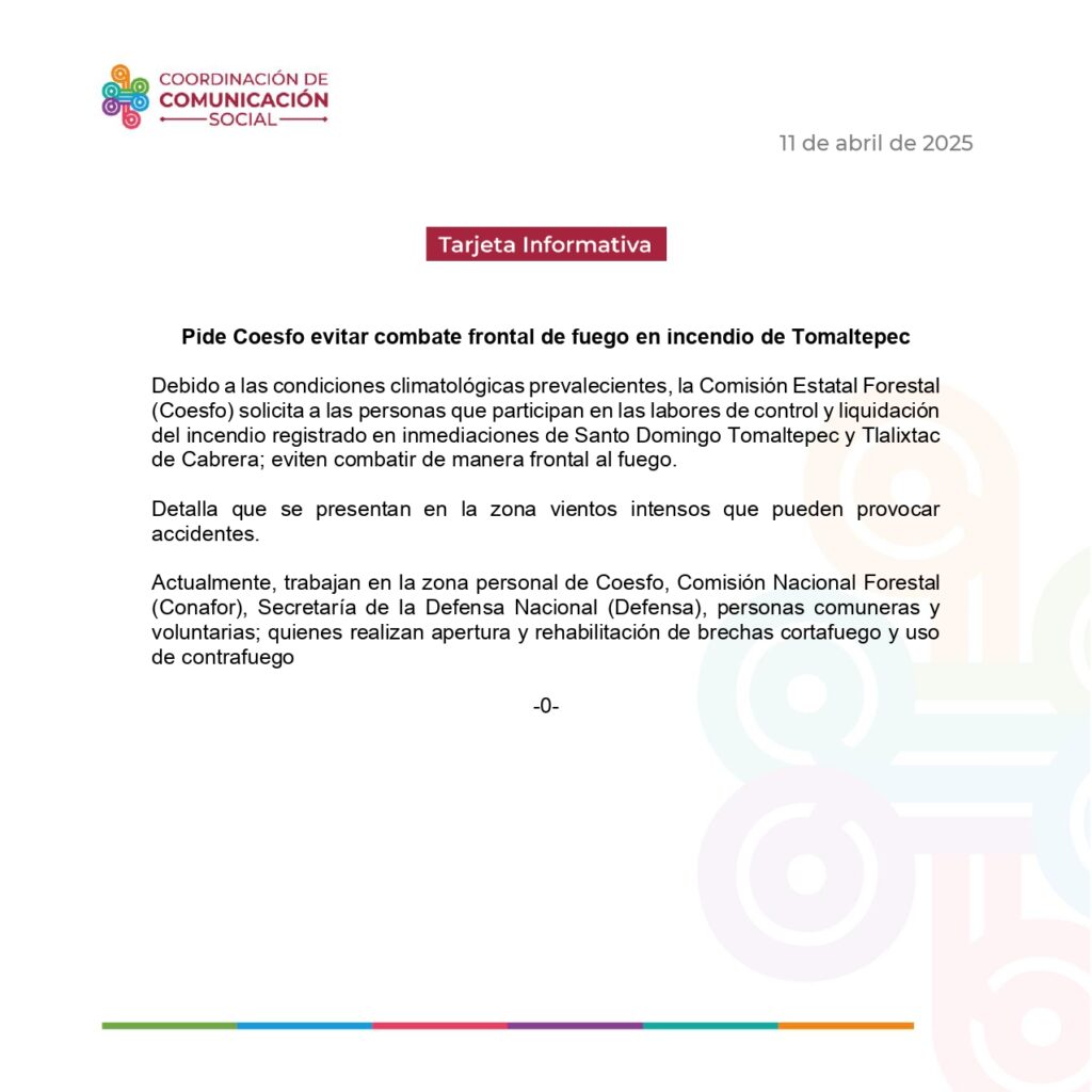 Debido a las condiciones climatológicas prevalecientes, la Comisión Estatal Forestal (Coesfo) solicita a las personas que participan en las labores de control y liquidación del incendio registrado en inmediaciones de Santo Domingo Tomaltepec y Tlalixtac de Cabrera; eviten combatir de manera frontal al fuego.
