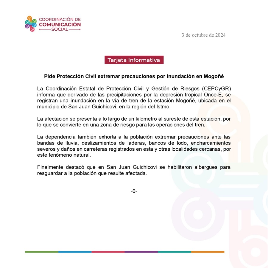 La Coordinación Estatal de Protección Civil y Gestión de Riesgos (CEPCyGR) informa que derivado de las precipitaciones por la depresión tropical Once-E, se registran una inundación en la vía de tren de la estación Mogoñé, ubicada en el municipio de San Juan Guichicovi, en la región del Istmo.