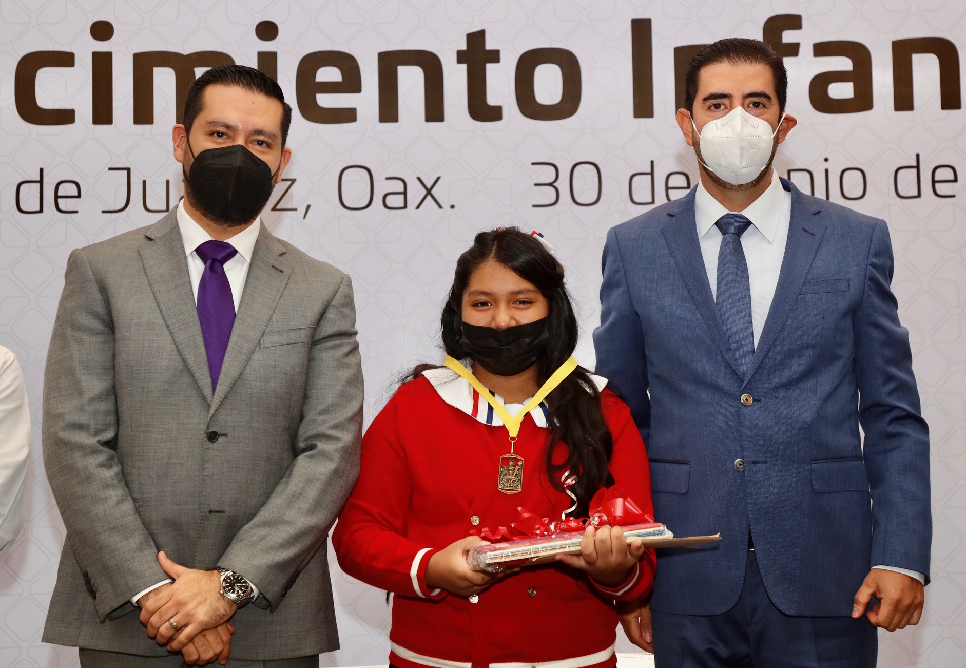 En la emotiva ceremonia, en la que también estuvo presente el subdirector General de Servicios Educativos del IEEPO, Álvaro César Guevara Ramírez, se entregaron reconocimientos a las niñas y niños ganadores, quienes recibirán también una beca mensual de la Fundación BBVA Bancomer.