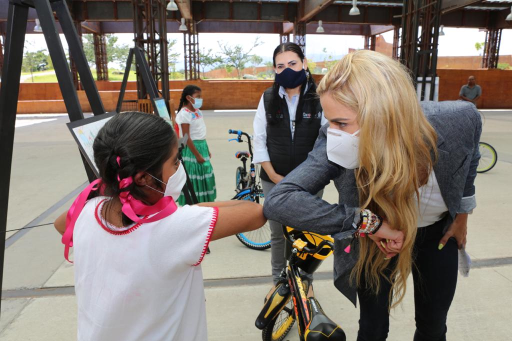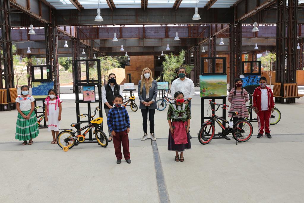 Durante el encuentro realizado en el Centro Cultural y de Convenciones, la presidenta del DIF Estatal, Ivette Morán de Murat, hizo la entrega de una bicicleta para cada una y cada uno de los ganadores, al tiempo que, escuchó de los participantes, las características y técnica utilizada durante la creación de sus dibujos.