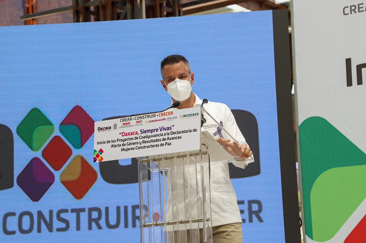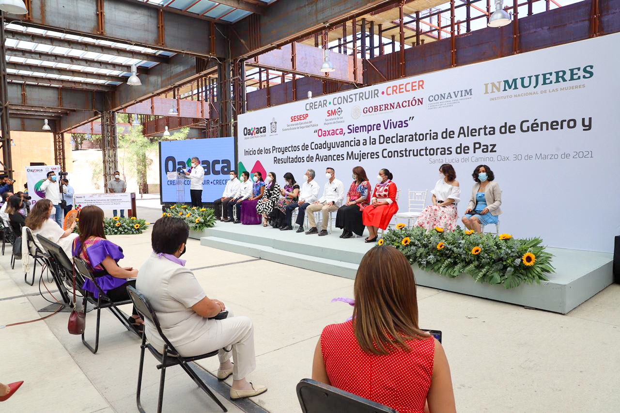Santa Lucía del Camino, Oax. 30 de marzo de 2021. “Seguiremos trabajando por la grandeza de las mujeres oaxaqueñas”, expresó el gobernador Alejandro Murat Hinojosa al participar en la presentación del programa “Por ellas, Acciones para familias víctimas de feminicidio”, el cual atenderá de manera integral mediante seis componentes y 22 acciones a las víctimas indirectas de este delito y a sobrevivientes de tentativa de feminicidio.