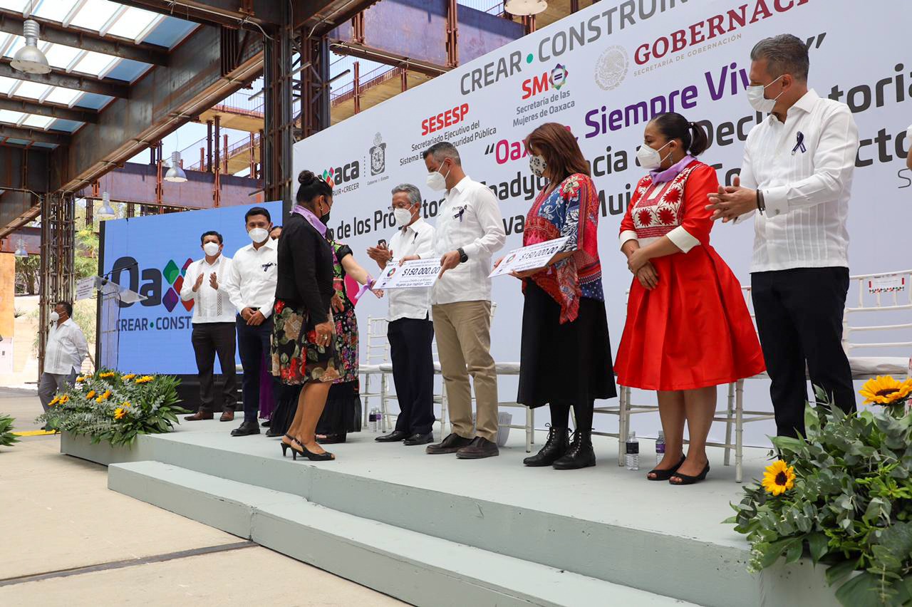 En este marco, Alejandro Murat Hinojosa hizo la entrega simbólica de tres Créditos a la Palabra, por un monto de 150 mil pesos cada uno, en apoyo a las familias de las víctimas de feminicidios.