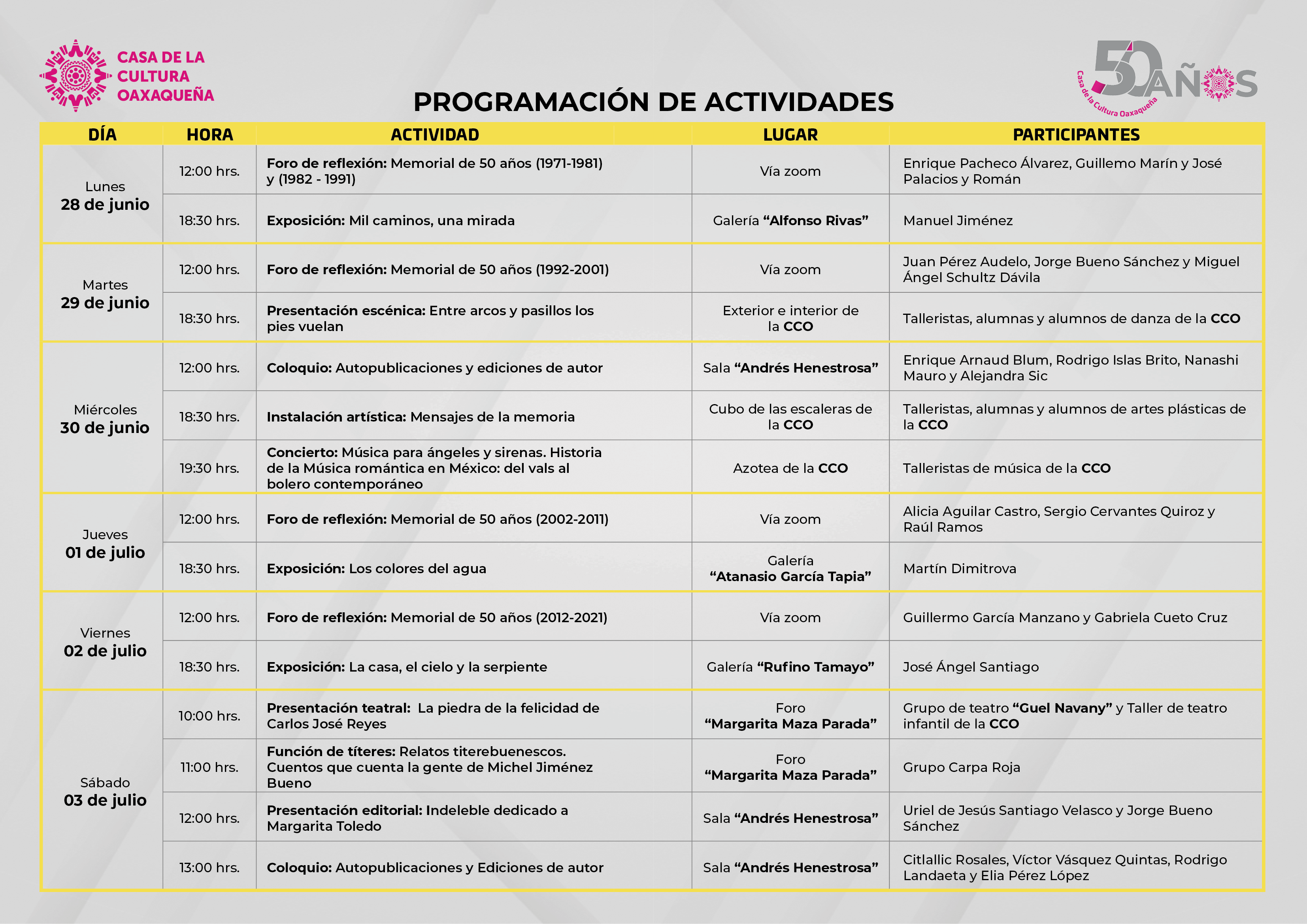 Asimismo, la ciudadanía podrá disfrutar del foro de reflexión Memorial de 50 años, el cual contará con la participación de las y los ex directores de la Casa de la Cultura Oaxaqueña, quienes aportarán sus vivencias y anécdotas ocurridas durante su gestión.