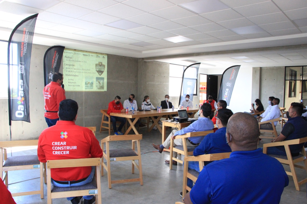Oaxaca de Juárez, Oax. 12 de octubre de 2021.- En la primera edición de los Juegos Nacionales de la Comisión Nacional de cultura Física y Deporte (Conade), antes Olimpiada Nacional, Oaxaca forma parte de las subsedes que se otorgaron este año, al albergar a la disciplina de Surfing, el cual fue presentado ante los medios de comunicación.