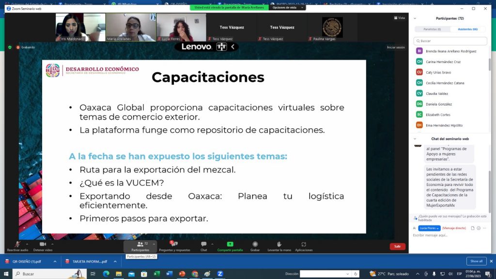 Ciudad de México. 29 de junio de 2023- En el marco de la conmemoración del Día de las Micro, Pequeñas y Medianas Empresas (Mipymes), de forma virtual se presentaron los esquemas denominados Orgullo Oaxaca y Oaxaca Global de la Secretaría de Desarrollo Económico (Sedeco), ello como parte del panel Programas de apoyo a mujeres empresarias que se desarrolló en la cuarta edición de Mujer Exporta MX.